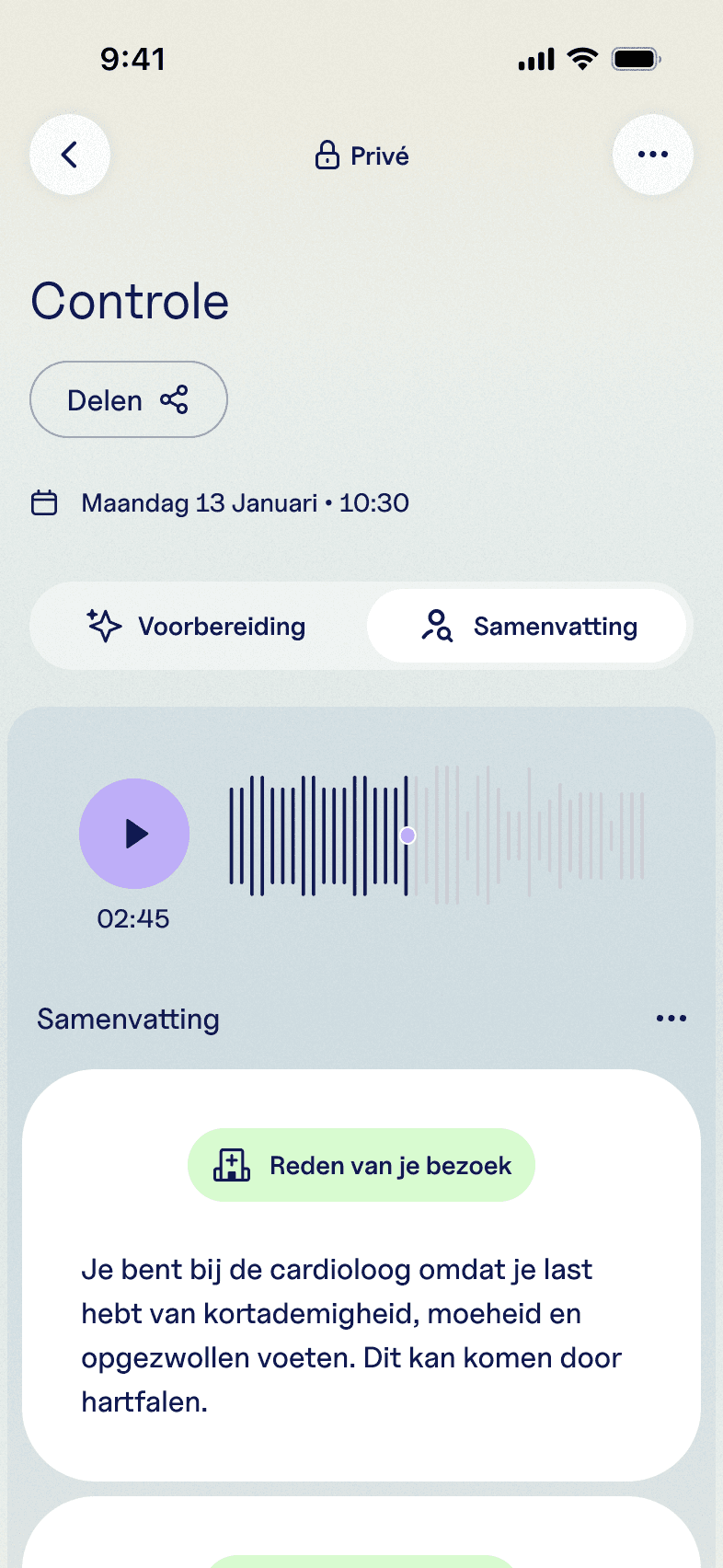 Neem elk medisch gesprek op. Krijg een duidelijke samenvatting in taal die je begrijpt. Deel het met de mensen om je heen. Want zorg draag je samen.