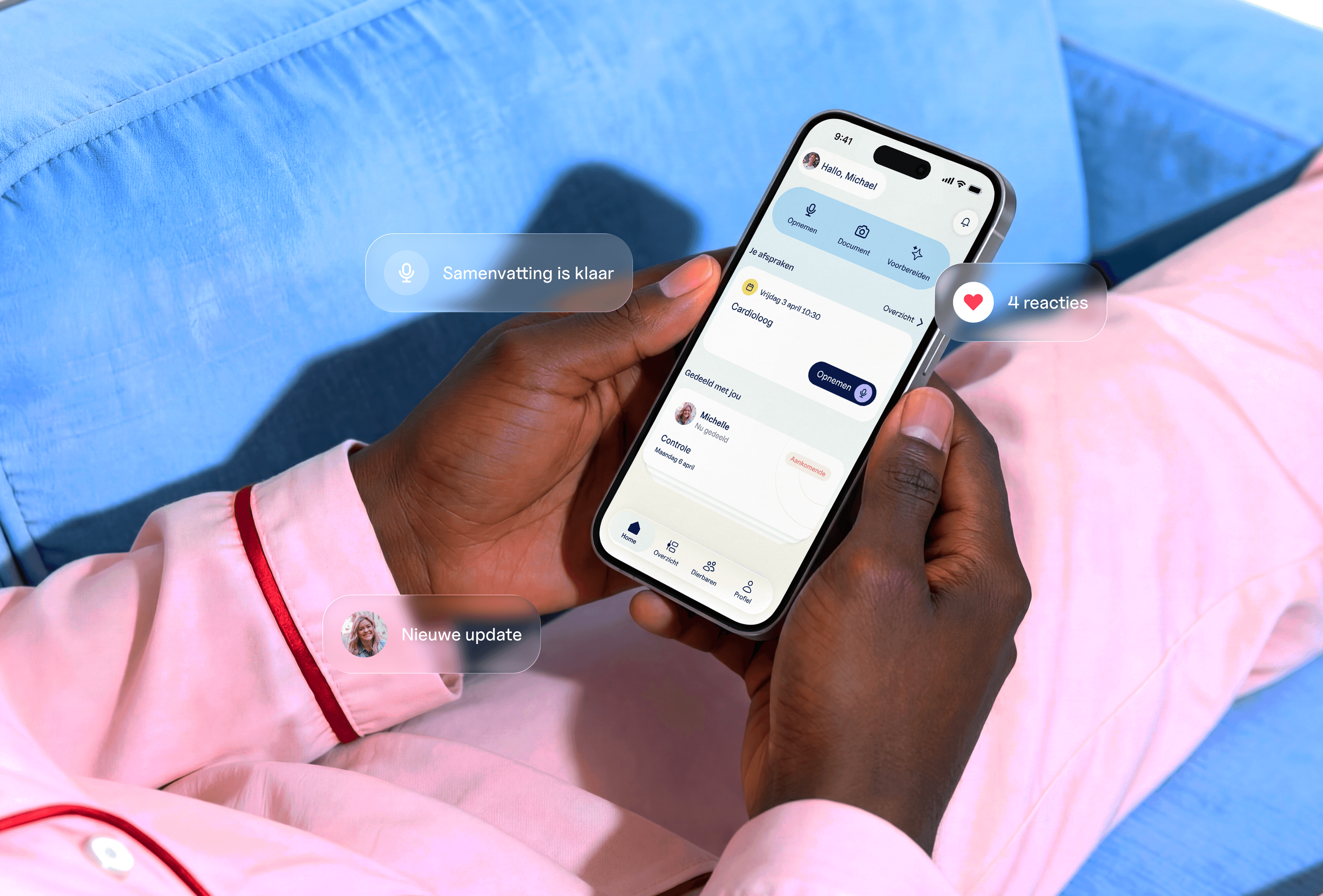 Je huisarts, je specialist, je verloskundige. Alles in één app. Elke afspraak, elke samenvatting, elk document. Waar je ook zorg krijgt.